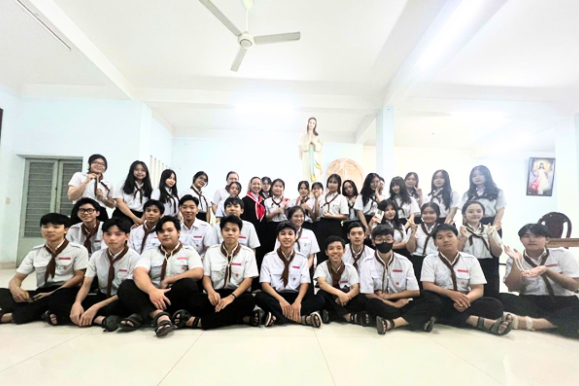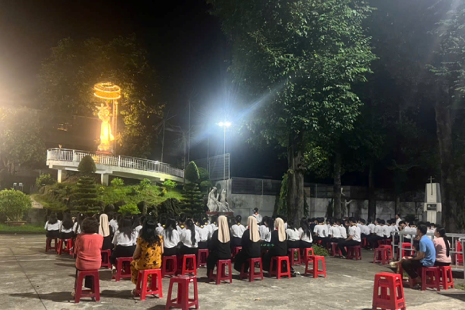 Trong làn gió nhè nhẹ cùng với ánh sáng đèn pha rực rỡ trong đêm tối, tại khuôn viên nhà thờ Giáo xứ Thanh Hóa, Giáo phận Xuân Lộc, trước ngai tòa Mẹ Maria, lúc 19h ngày 25/10/2024, các bạn trẻ ngành Hiệp Sĩ đã có giờ lần chuỗi Mân Côi nhân dịp tháng kính Đức Mẹ Mân Côi. Đồng hành với các bạn có quý sơ Dòng Nữ Tỳ Chúa Giêsu Linh Mục, các anh chị Giáo lý viên và một số giáo dân trong Giáo xứ.